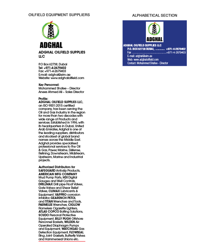 Key Personnel : Mohammed Shafee - DirectorADGHAL OILFIELD SUPPLIES LLC has been delivering Supply Chain Solutions to Oil, Gas and Power Projects all over Middle East and North Africa since 2000. Over the last decade, ADGHAL OILFIELD SUPPLIES LLC has established itself with a reputation as a reliable source of quality products from reputed manufacturers, distributors and suppliers around the globe. We offer a complete worldwide import/export service including order consolidation, export crating, customs clearance and delivery to your requested destination.