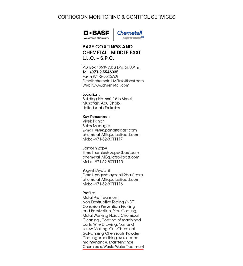 Location : Building No. 660, 16th Street, Musaffah, Abu Dhabi, United Arab Emirates Key Personnel : Vivek Pandit - Sales Manager