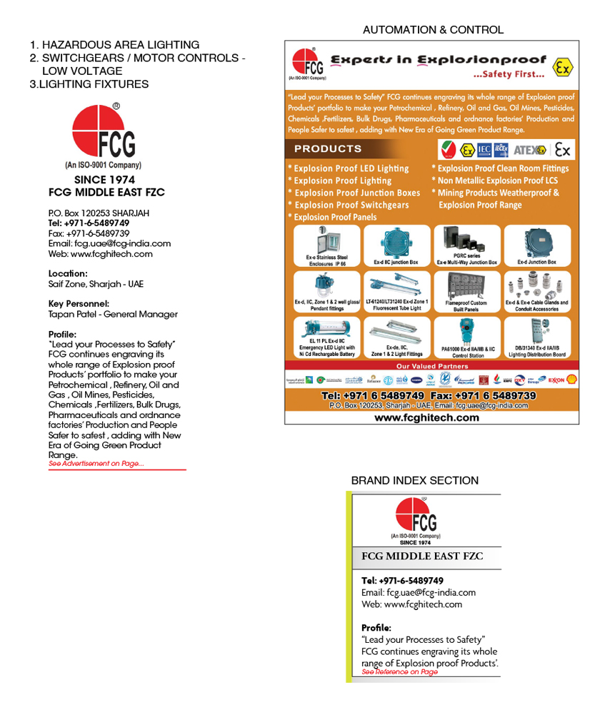 Brands : FCGFCG which was formerly known as CEAG FCG Pvt. Ltd. has achieved remarkable strides in the field of explosion-protected equipments over a period of last three decades. Having started its operation at Mumbai in 1974, FCG has come a long way up and established itself as a leader in this market segment. Operating from its head-quarters at Mumbai and from the regional offices across the country, FCG has been able to be at the close proximity with the customers.