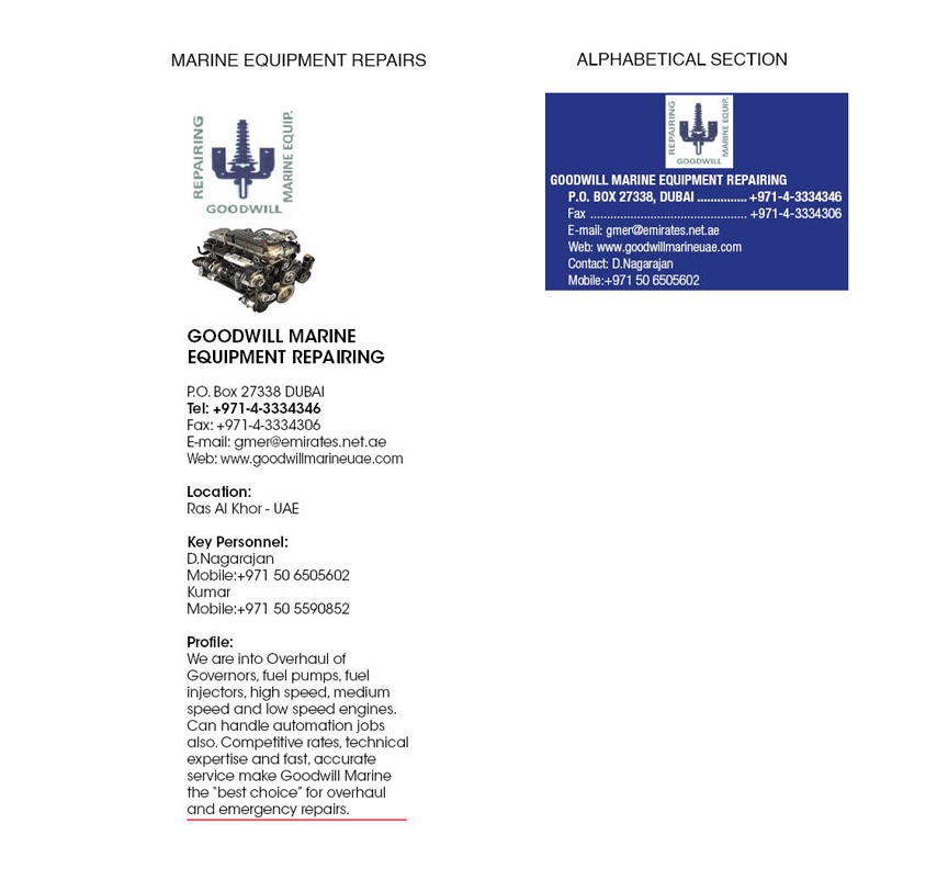 Key Personnel : Nagarajan - Managing DirectorGoodwill Marine Repairs and do Overhaul Services for WOODWARD, REGULATEURS EUROPA, DIESEL KIKI and Mechanical Governors used in Main Engines, Auxiliary Engines, Cargo Turbines, Marine Engines, Generators and Auxiliary applications.