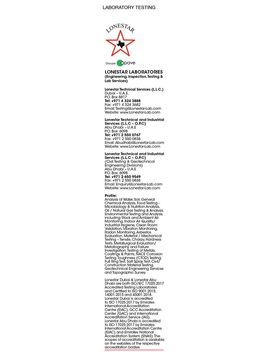 Lonestar Dubai & Lonestar Abu Dhabi are both ISO/IEC 17025:2017 Accredited Testing Laboratories and Certified to ISO 9001:2015, 14001:2015 and 45001:2018. Lonestar Dubai is accredited to ISO 17025:2017 by Emirates International Accreditation Centre (EIAC), GCC Accreditation Center (GAC) and International Accreditation Service (IAS). Lonestar Abu Dhabi is accredited to ISO 17025:2017 by Emirates International Accreditation Centre (EIAC) and Emirates National Accreditation System (ENAS). The scopes of accreditation is available on the websites of the respective accreditation bodies.