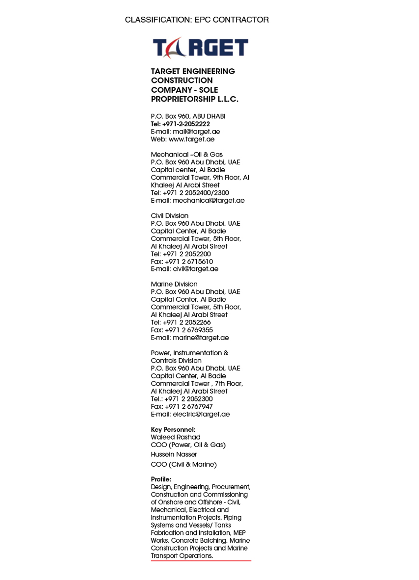 Location : Capital Center, Al Badie Commercial Tower, 9th Floor, Al Khaleej Al Arabi Street Key Personnel : Waleed Rashad - COO ( Power, Oil & Gas )Design, Engineering, Procurement, Construction and Commissioning of Onshore and Offshore - Civil, Mechanical, Electrical and instrumentation Projects, Piping Systems and Vessels / Tanks Fabrication and Installation, MEP Works, Concrete Batching, Marine Construction Projects and Marine Transport Operations.