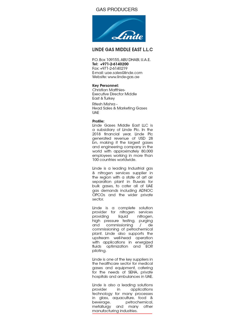 Linde is Leading Industrial gas & Nitrogen services supplier in the region with State of Art air separation plant in Ruwais for bulk gases, to cater ADNOC OPCo's and Regional Gas demand.