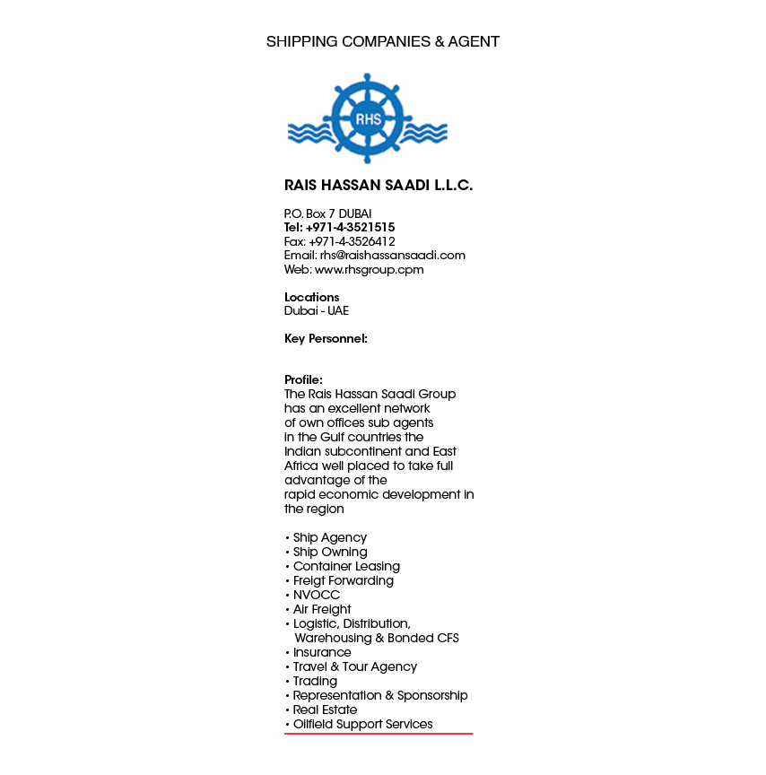 Location : Dubai - U.A.E Key Personnel : Mr. Refaideen - ManagerThe Rais Hassan Saadi Group has an excellent network of own offices sub agents in the Gulf countries the Indian subcontinent and East Africa well placed to take full advantage of the rapid economic development in the region