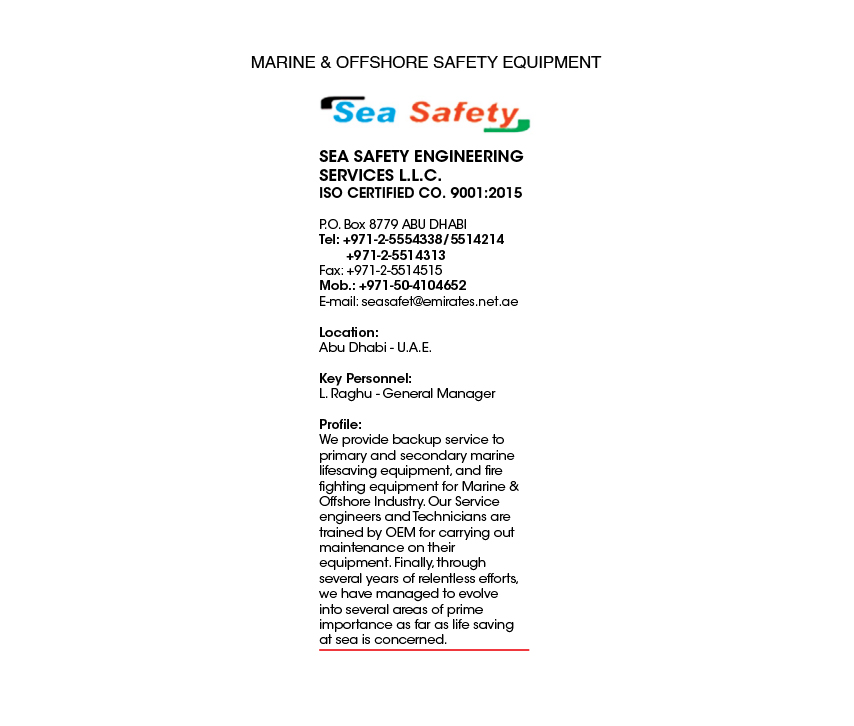 Key Personnel : L. Raghu - General ManagerSea Safety Engineering Services was established in 1983 to provide quality Marine Life Saving Equipment and Services to Marine & Offshore Industry. In the era of global expansion, rapid freight and cruise movements, it is imperative that all safety related concerns of the shipping industry are handled with a lot of care and attention. Hence, Sea Safety has evolved into a one-stop service station.