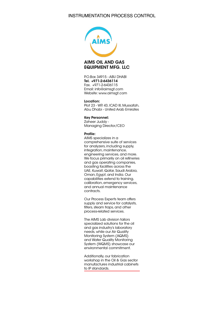 Location : Office No 103, 1st Floor, RAK Ceramic Building, Next to ADCB Bank, Beside Millennium Super Market, A Key Personnel : Zaheer Juddy - Managing DirectorAnalytical Instrumentation & Maintenance Systems (AIMS) is founded to provide expertise service for Analytical Instrumentation. The company is led by personnel with specialized experiences in Analytical Instruments and System Development supported by a team of service personnel in the field of related process automation. These services are widely spread in Analytical Instrumentation, Process Solutions, Sulphur Recovery Optimization and equipment related to Sulphur Recovery Units.