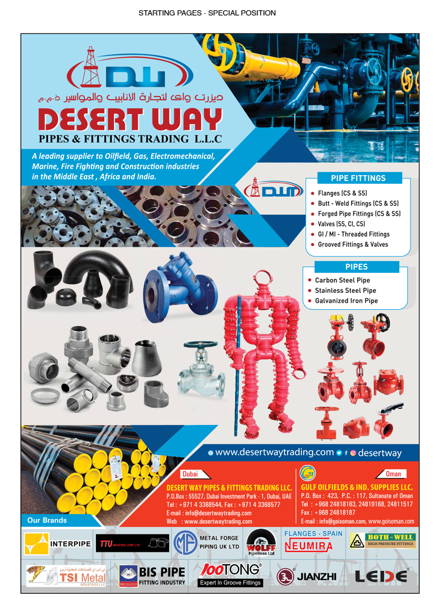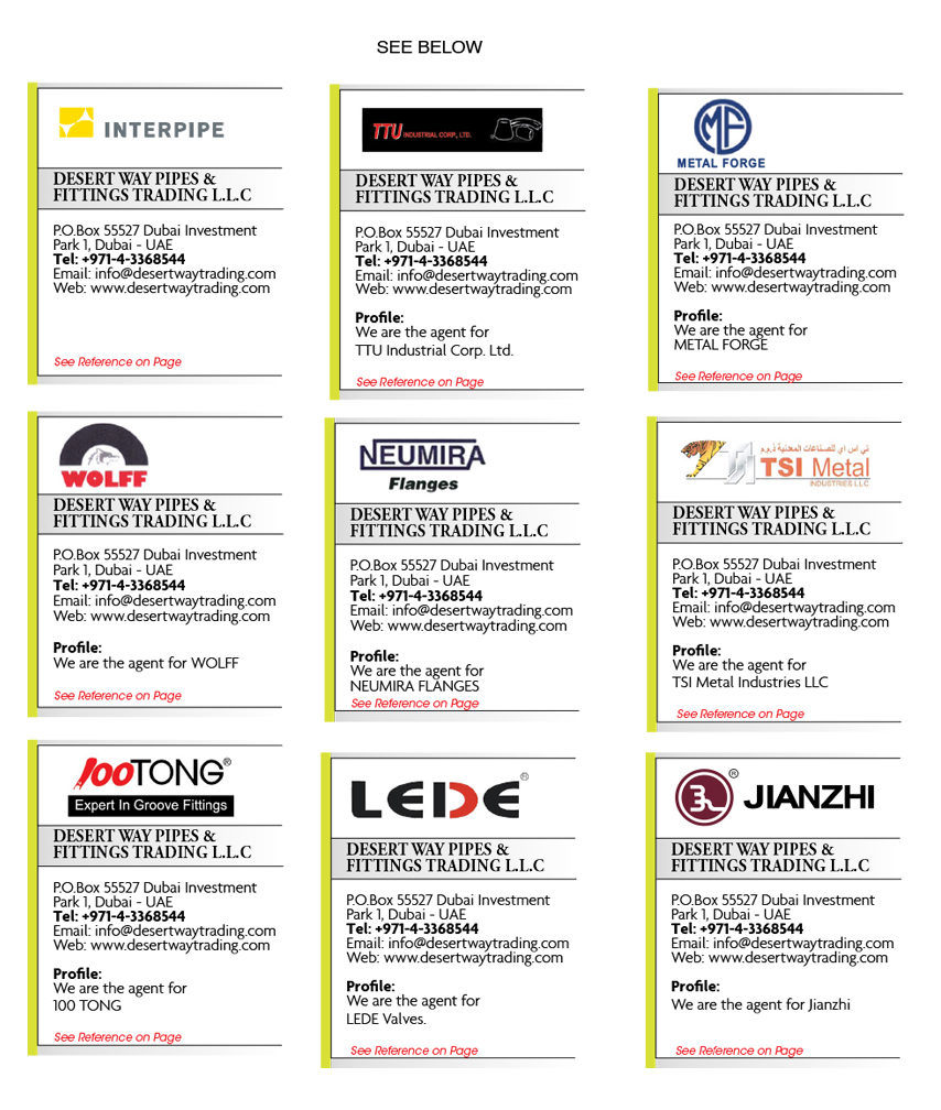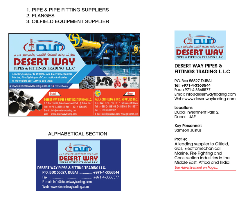 Location : Dubai Investment Park - Dubai - UAE Key Personnel : Samson Justus - Managing DirectorDESERT WAY Pipes & Fittings Trading LLC represents an enthusiastic team who understands the importance of team work, recognize the efforts made by others and respect their opinions. Here, we are referring not only to our relationships with one another but also our relationships with suppliers and other partners-especially our customers.