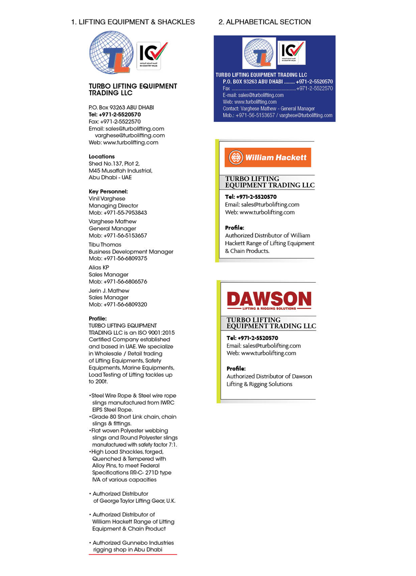 Location : Shed No, 137, Plot 2, M45 Mussafah Industrial Key Personnel : Varghese Mathew - General ManagerTURBO LIFTING EQUIPMENT TRADING LLC is an ISO 9001:2008 Certified Company established and based in UAE. We specialize in Wholesale / Retail trading of Lifting Equipments, Safety Equipments, Marine Equipments, Building Materials, Hardware & Tools.