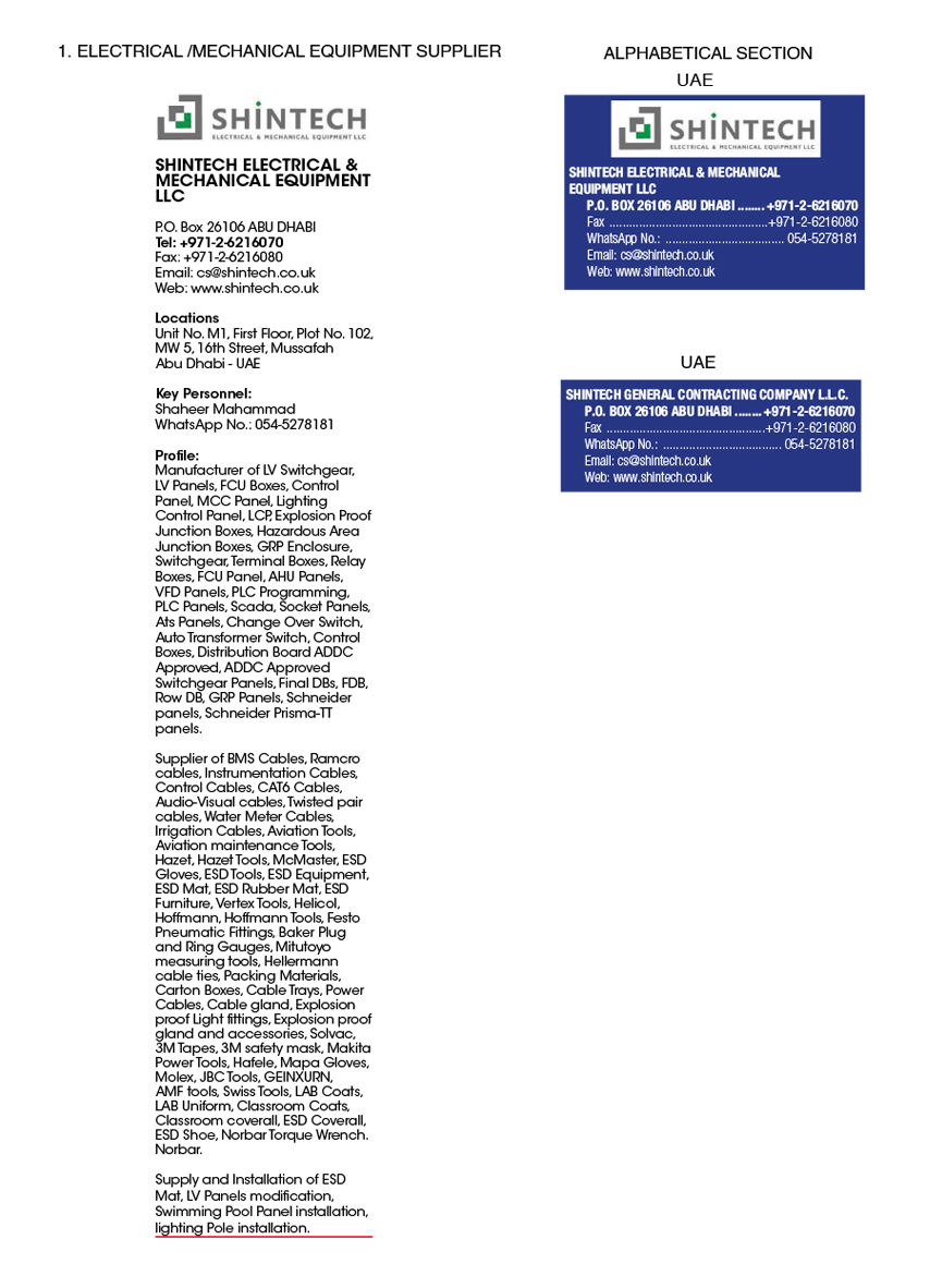 Location : Unit No. M1, First Floor, plot no. 102, MW 5, 16th Street, Musaffah Key Personnel : Shaheer MahammadShintech Electrical & Mechanical Equipment LLC specializes in trade of Electrical, Mechanical, Instrumentation, Safety products, manufacturing of Low Voltage Switchgear Panels and General Contracting.