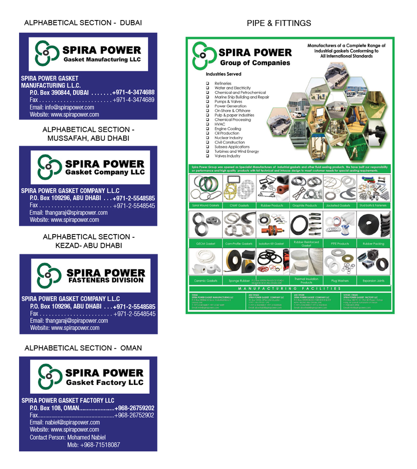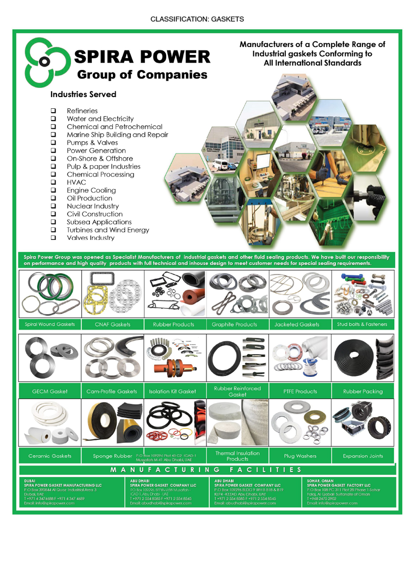 Key Personnel : Mohamed Nabiel - Sales & Operations - ManagerSpira Power,UK Based Company engaged in designing, manufacturing and marketing of complete range of Fluid sealing products to serve all kind of Industrial sectors in Middle East. Product Range: • (CNAF, Rubber, PTFE, Graphite etc) • Flange Insulation Kit • Spiral wound gaskets • Ring Joint gaskets • Heat Exchanger gaskets • Gland Packings for Pumps and valves • Thermal Insulation Products (Ceramic Rope,Tape & Cloth) • Expanded PTFE Joint Sealant • Expansion joints • Stud Bolts & pipe fittings