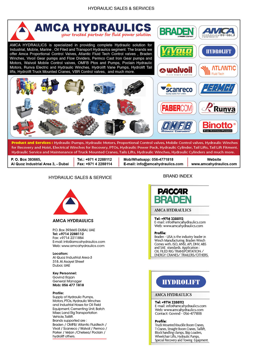 Location : Al Quoz Industrial Area - 3 Key Personnel : Govind Rajan - General ManagerAMCA HYDRAULICS is specialized in providing complete Hydraulic solution on Industrial, Mobile and Transport Hydraulics segment. Backed with the support of world renowned brand like Braden Walvoil, Permco Marchesini, Hydrocontrol, Vivoil, Runva Winches OMFB, Binotto, Scanreco and Fabercom