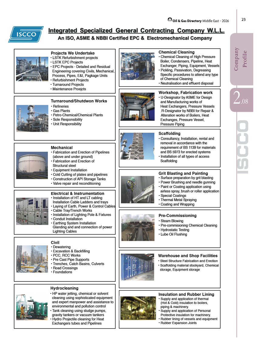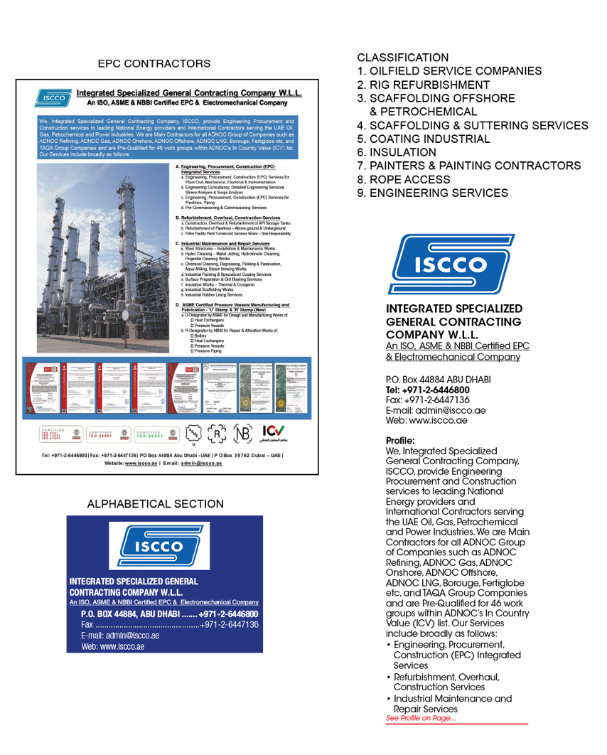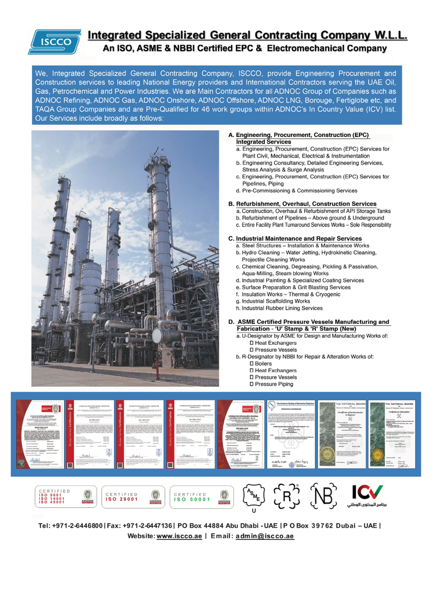 We, integrated Specialized General Contracting Company. ISCCO, Provide Engineering Procurement and Construction Services to leading National Energy Providers and International Contractors serving the U.A.E Oil, Gas, Petrochemical and Power Industries. We are main Contractors for all ADNOC Group of Companies such as ADNOC Refining, ADNOC Gas Processing, ADNOC Onshore, ADNOC Offshore, ADNOC LNG, Borouge, Fertiglobe etc.