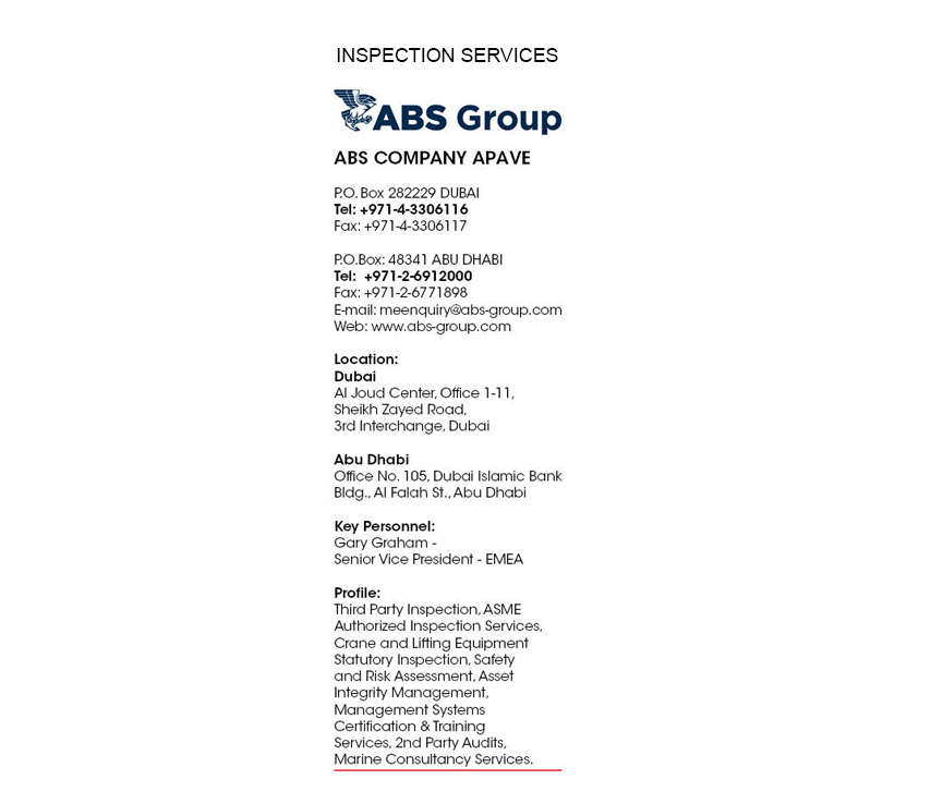 Location : Al Joud Center, Office 1-11, Sheikh Zayed Road, 3rd Interchange Key Personnel : Gary Graham - Senior Vice President, EMEAThird Party Inspection, ASME Authorized Inspection Services, Crane and Lifting Equipment Statutory Inspection, Safety and Risk Assessment, Asset Integrity Management, Management Systems Certification & Training Services, 2nd Party Audits, Marine Consultancy Services.