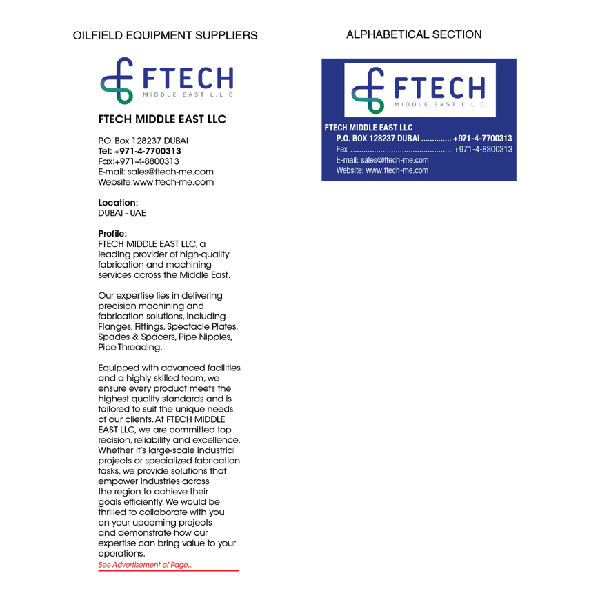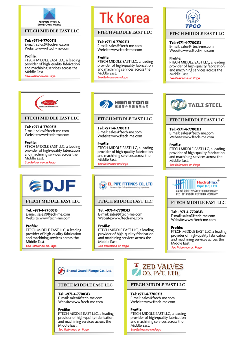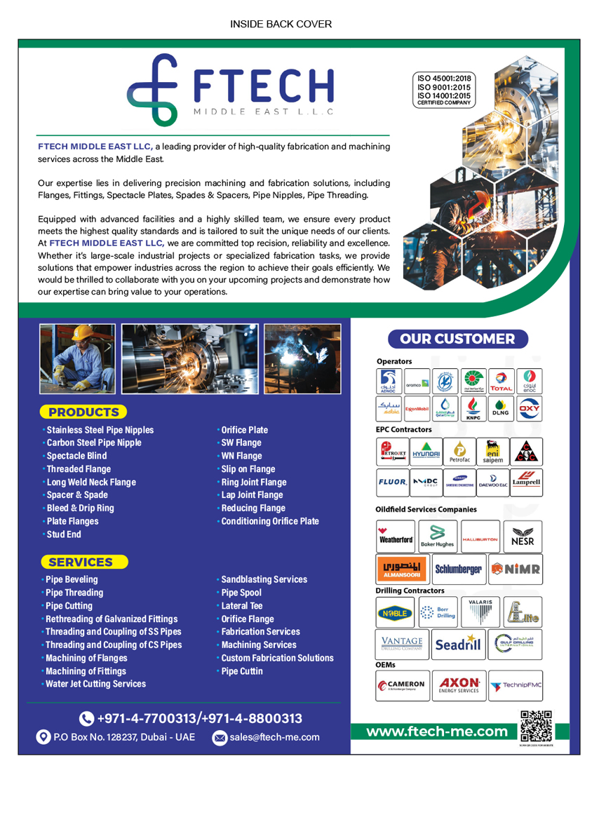 Location : Dubai - UAEOur expertise lies in delivering precision machining and fabrication solutions, including Flanges, Fittings, Spectacle Plates, Spades & Spacers, Pipe Nipples, Pipe Threading. Equipped with advanced facilities and a highly skilled team, we ensure every product meets the highest quality standards and is tailored to suit the unique needs of our clients. At FTECH MIDDLE EAST LLC, we are committed to precision, reliability, and excellence.