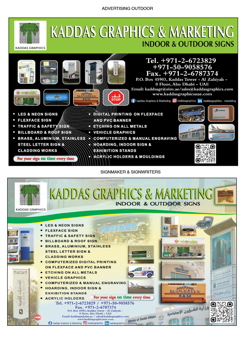 Location : Kaddas Tower, Al Zahiya, Ground FloorKaddas Graphics provides the market with the best services based on international standards and high-quality specifications at competitive prices in the field of Indoor & Outdoor signage industries in which to facilitate reliable sign Systems and Digital Printing.